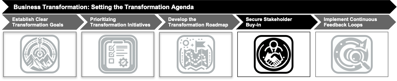 Securing stakeholder buy-in is a crucial aspect of successfully implementing a transformation agenda in B2B SaaS companies. Without the support and commitment of key stakeholders—such as executives, managers, employees, customers, and partners—transformation efforts can face significant resistance, resulting in delays, reduced effectiveness, or outright failure. To secure buy-in, companies must engage stakeholders early in the process, ensuring they understand the transformation's goals and the benefits it brings. This early engagement fosters a sense of ownership and encourages stakeholders to contribute their insights, leading to a more inclusive and comprehensive transformation approach.